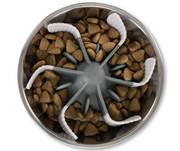 Stimulate your mutt…while slowing their intake. Transform your existing dog bowl into a slow feeder in one simple step. The universal design has wings that bend to create multiple compartments around food, encouraging your dog (or cat) to 'hunt' for each bite. Slower feeding can help improve digestion and reduce bloating.